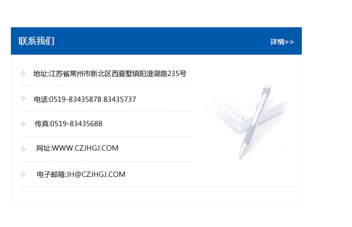 地址:常州市新北區友邦商務大廈1幢16、17層  電話:0519-85101652  傳真:0519-85112595  郵編:213022  網址:www_cz-jiayue_cn.hunmount.com  郵箱:xiajifengaa@163.com
